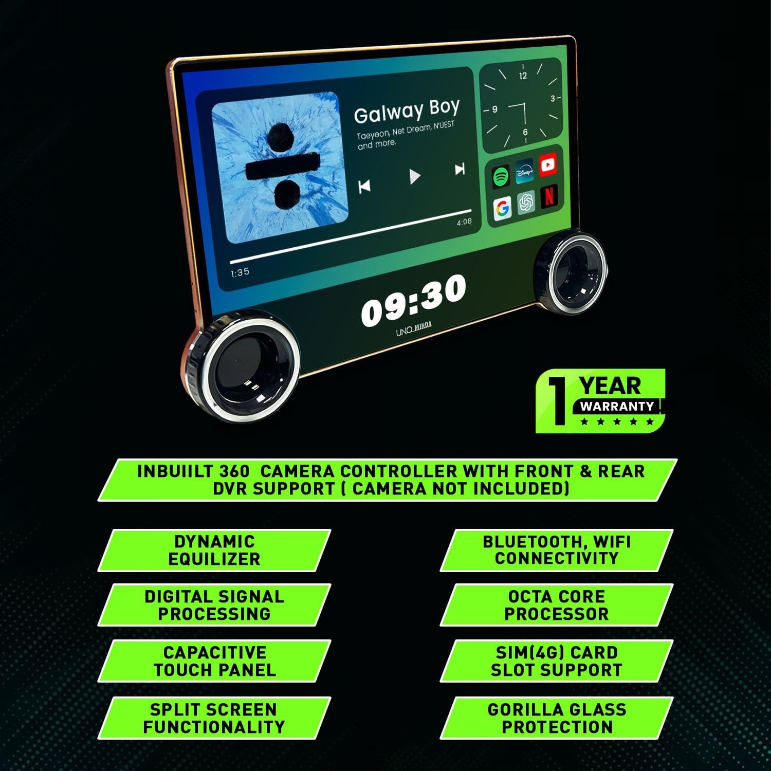 Additional features include an inbuilt 360° camera controller for improved safety, high-definition audio with a robust 208W output, and advanced digital signal processing (DSP). The system also offers a dynamic equalizer for personalized audio settings and split-screen functionality for multitasking. A comprehensive accessory kit is included, featuring a microphone, screws, a 4G antenna, and wiring with a SIM card slot.